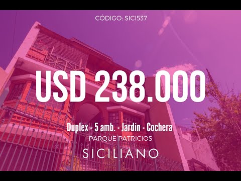 Venta, 5 ambientes - Jardín y cochera - Parque Patricios. <br> <div>Av. Chiclana al 3100</div><div><br></div><div>Duplex</div><div>Ingreso independiente</div><div>5 ambientes<br></div><div>Con cochera, jardín, fondo y balcones.</div><div><br></div><div>Código: SICI537</div><div>En la publicación encontrás: <br>- Videoclip del inmueble<br>- Tour virtual 360°</div><div>- Plano esquemático</div><div><br></div><div>DESCRIPCIÓN DE LA UNIDAD FUNCIONAL:</div><div><br></div><div>PB: </div><div>- Cochera</div><div>- Jardín y parrilla</div><div>- Quincho / lavadero</div><div>- Toilette</div><div>- Baulera individual (distintos espacios de guardado)</div><div><br></div><div>1° planta:</div><div>- Ingreso por palier semiprivado</div><div>- Living</div><div>- Comedor</div><div>- Cocina comedor independiente con salida al balcón</div><div>- Balcón</div><div>- Toilette</div><div><br></div><div>2° planta:</div><div>- Hall de distribución</div><div>- Dormitorios: 2 Con placard</div><div>- Balcones: 2</div><div>- Baño completo: 1</div><div>- Baño en suite: 1</div><div><br></div><div>3° planta</div><div>- Hall de distribución</div><div>- Dormitorios: 2 Con placard</div><div>- Baño completo</div><div><br></div><div><br></div><div>SUPERFICIE:</div><div><br></div><div>Sup. total: 246,84m²</div><div>Sup. cubierta: 139,02m²<br></div><div>Sup. semicubierta: 45,96m²<br></div><div>Sup. descubierta: 61,86m²<br></div><div><br></div><div><br></div><div>INSTALACIONES:<br></div><div>- Gas Natural<br></div><div>- Electricidad<br></div><div>- Agua caliente por termotanque de alta recuperación</div><div>- Calefacción por radiadores (caldera a gas)</div><div><br></div><div><span style="font-size: 14px;">SERVICIOS e IMPUESTOS:</span></div><div>Aysa: $50.000 (con medidor)</div><div>Luz: $4.000 (según consumo)</div><div>Gas: $4.500</div><div>Expensas: No posee.</div><div><br></div><div>ESTADO:<br></div><div>Muy buen estado. </div><div>Excelente iluminación y ventilación cruzada.</div><div><br></div><div>EDIFICIO<br></div><div>- Entre medianeras tipo duplex</div><div>- 2 unidades funcionales en total.</div><div><br></div><div>ACCESOS:<br></div><div>-Frente a la Av. Chiclana</div><div>-Entre las calles Gral. Urquiza y 24 de Noviembre</div><div>-A seiscuadras de Av. San Juan</div><div>-A una cuadra de Av. Brasil </div><div>-A cuatro cuadras de Av. Caseros</div><div>-A cuatro cuadras de Parque Patricios </div><div>-A cinco cuadras de Av. Boedo</div><div>-Colectivos: 4, 6, 28, 31, 32, 75, 97, 101, 133, 134, 143, 188<br></div><div>-Subte cercano: línea H ( Hospitales / Parque Patricios), línea E (Gral. Urquiza)</div><div><br></div><div>Nota: Las superficies exactas surgirán del título correspondiente.<br></div><div>Nota: La unidad funcional no cuenta con accesibilidad para personas con movilidad reducida. Escaleras de acceso.</div><div>Nota: Documentación en orden, a la espera del <span style="font-size: 14px;">otorgamiento de la DH marzo 2025.</span></div><div>Nota: Los valores otorgados de las facturas de los servicios y abl son aproximados y corresponden al mes en curso de publicación.<br></div><div><br></div><div><br></div><div><br></div><div><br></div><div><br></div><div><br></div><div><br></div><div><br></div><div><br></div><div><br></div><div><br></div><br>